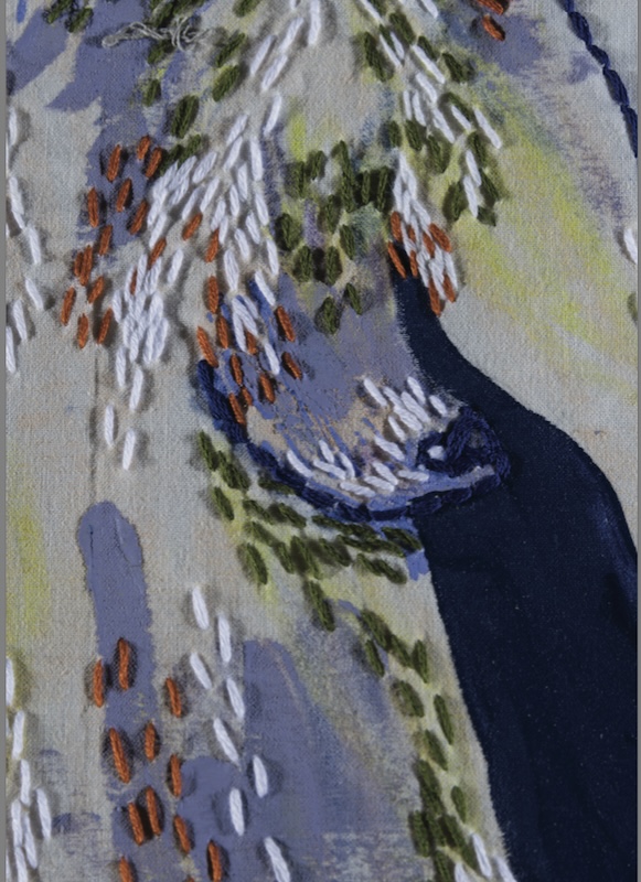 Son travail se joue des frontières : entre peinture et art textile, entre geste spontané et matière brute. Filets de pêche, cordes, tissus découpés — elle détourne les codes traditionnels de la broderie pour en faire quelque chose d’autre. Quelque chose de vivant.